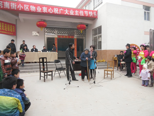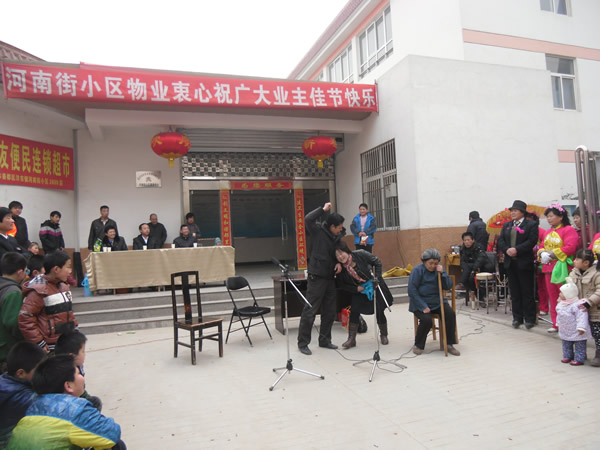 。ㄐ畔T:李建華)農(nóng)歷正月十三(2月4日),河南街小區(qū)鑼鼓喧天,彩旗招展,熱鬧非凡,呈現(xiàn)出一片祥和的節(jié)日氣氛。 上午10時聯(lián)歡會準(zhǔn)時開演,小區(qū)業(yè)主自編自演的腰鼓舞、扇子舞、拉開了這次活動的序幕,他們以優(yōu)美、歡暢的舞姿,以矯健穩(wěn)定的舞步,揮舞著手中的彩帶與鼓錘,生龍活虎,時伏時起。精彩的表演,贏得了在場觀眾的陣陣掌聲,尤其是小品《遲到的紅梅》將聯(lián)誼會逐漸推向了高潮,詼諧幽默地方話臺詞、真情再現(xiàn)的感情留露,深深的感染著在場的每一位觀眾。同時也讓我們清醒的認(rèn)識到,尊老愛幼的傳統(tǒng)美德,無論在什么時候,我們都應(yīng)該繼承與發(fā)揚,理解與關(guān)愛自己身邊的長輩與老人。 通過這次聯(lián)誼會,不但拉近與改善了物業(yè)與業(yè)主的關(guān)系,也活躍了小區(qū)精神文化生活,同時也體現(xiàn)了物業(yè)與小區(qū)業(yè)主都是一家人的魚水之情,鼓舞了物業(yè)辦全體員工繼續(xù)搞好小區(qū)各項工作的信心。